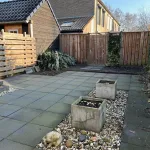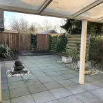 De aangelegde achtertuin, op het oosten gelegen, beschikt over een waterpartij en een achterom.